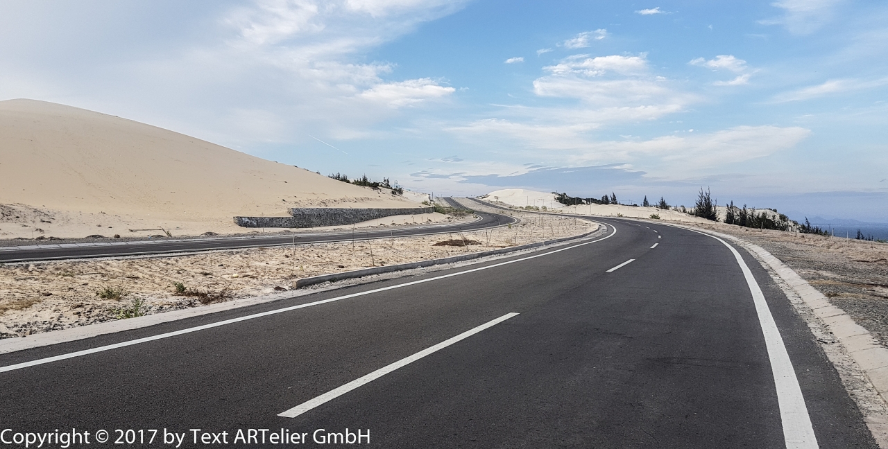 Heute zwei Impressionen eines Motorrad-Ausflugs nach Mui Ne, bekannt für seinen Sand und Strand. Auf dem Rückweg entdeckte ich eine neue erstelle, vierspurige Strasse mitten durch die Sanddünen. Sanfte Kurven, neuer Belag, keine Schlaglöcher, kein Verkehr, keine Tiere und keine Geschwindigkeitskontrollen.