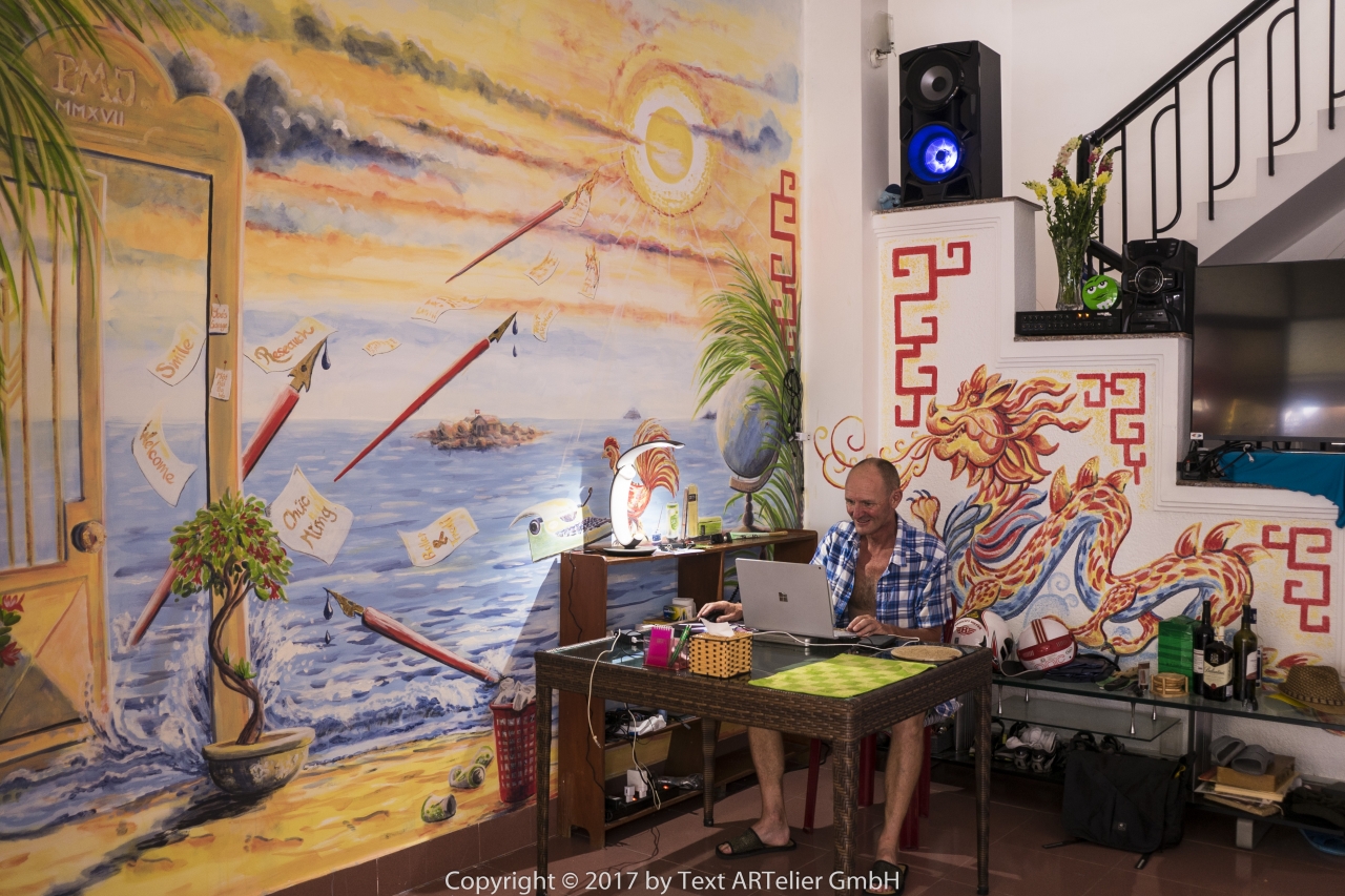 Mein Freund Kurt A. Fischli (Hinwil) gestaltete hier in meinem Haus in Nha Trang meinen Arbeits-Raum mit drei Wandbildern und das mit durchschlagendem Erfolg. Weitere Aufträge stehen an.