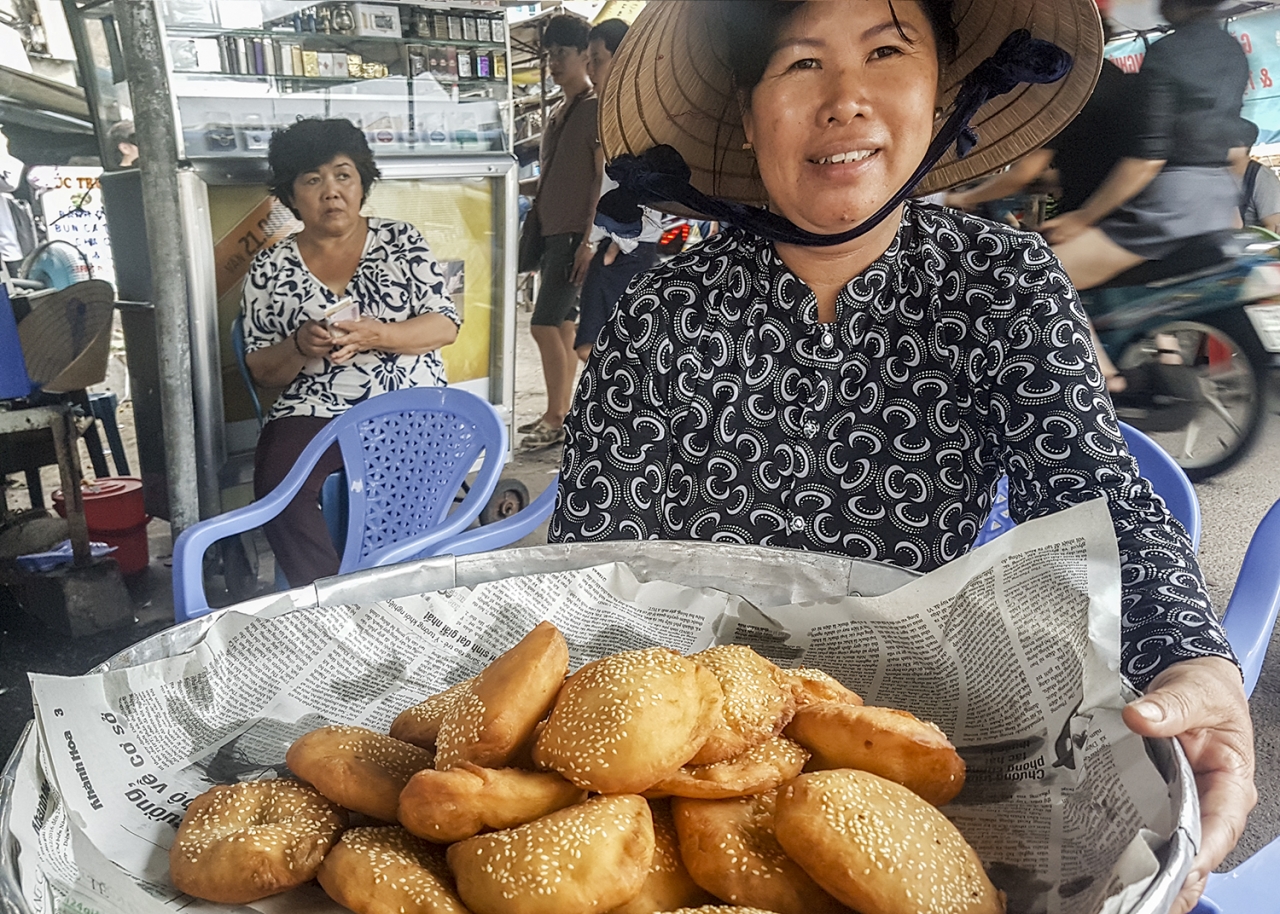 Bánh tiêu – vietnamesische Hohlkrapfen. Oh, ich liebe sie. Mit Sesam, leicht gummig in der Konsistenz kann ich sie mit meiner lädierten Zunge wunderbar essen und sie sind: honigsüss!