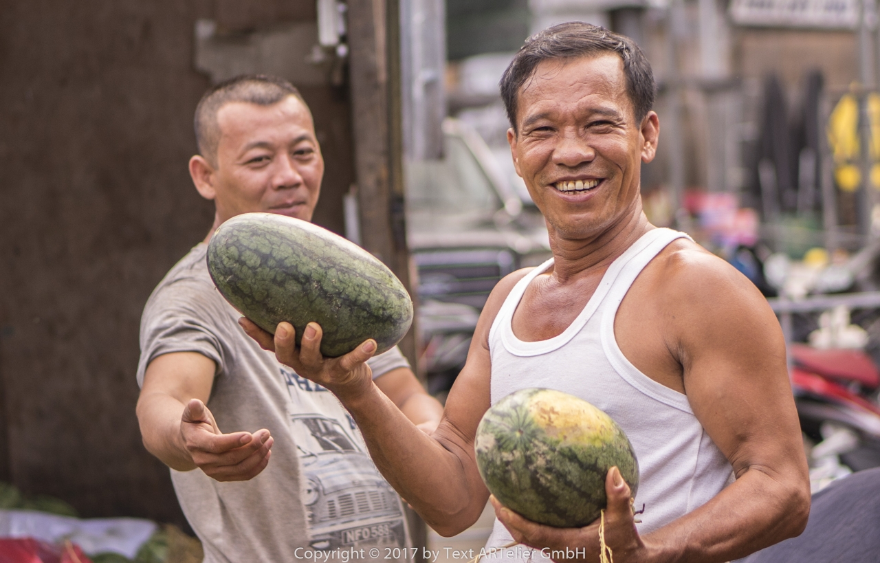 Diese beiden Männer entladen auf dem Dam-Markt einen Lastwagen mit Melonen. Ich kam dazu, fragte für ein Foto und kriegte dieses Lachen: ehrlich, herzlich und voller Lebensfreude.