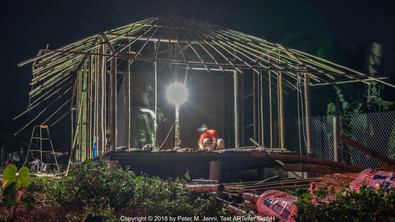 Bambus ist ein äusserst vielseitiges, gut zu bearbeitendes, stabiles und (für mich als Neuling) spannendes Material, das ich nah dies nah zu entdecken beginne. Als erstes baue ich unter gütiger Mithilfe von Hiep’s Bruder Trong eine Freiluft-Bambus-Dusche, dann ist noch ein runder Tisch mit Sonnenschirm geplant.