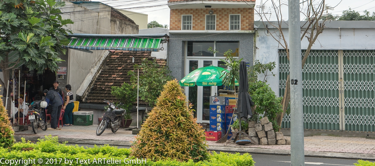 Das schmalste Haus, das ich bis jetzt gesehen habe, steht in Nha Trang ganz in der Nähe des Fischerhafens. Bei genauem Betrachten sieht man, dass es kaum viel breiter ist als der Werbe-Sonnenschirm, der davorsteht. Ich schätze mal, viel über zwei Meter ist das nicht.