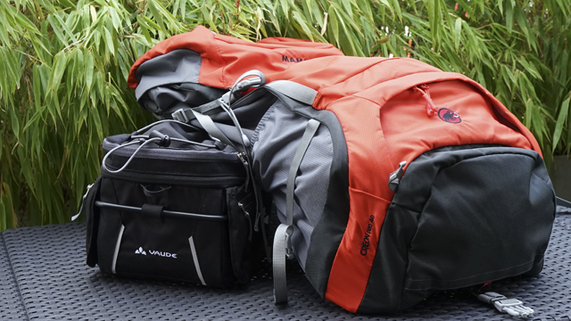 «Vierzig Liter sind gerade Mal zehn Liter pro Monat», witzelt Peter Jenni. Deshalb hat er sein Gepäck noch um eine universelle Satteltasche von Vaude erweitert. Der Off Road Bag M hängt während den Bike-Etappen hinten am Sattel, kann mit seinen 10 Litern Fassungsvermögen bei Tagesausflügen als Gepäck genutzt werden und wenn das Bike mal im Hotel steht und Peter Jenni zu Fuss unterwegs ist, dann ist die Satteltasche im Nu eine Handtasche, die er sich bequem über die Schultern hängen kann.