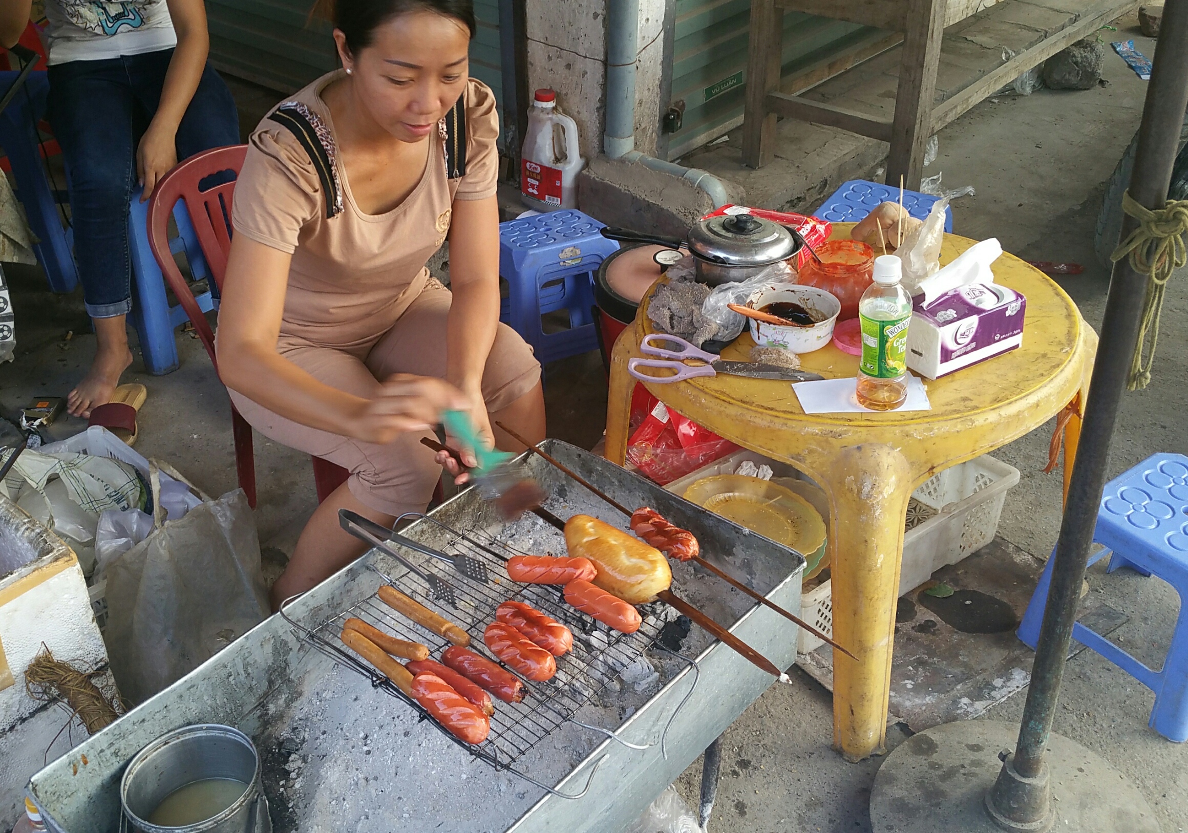 Auf Wunsch wid die Wurst aber noch in ein mit fettiger Flüssigkeit bestrichenes und getoastetes Brot gelegt.