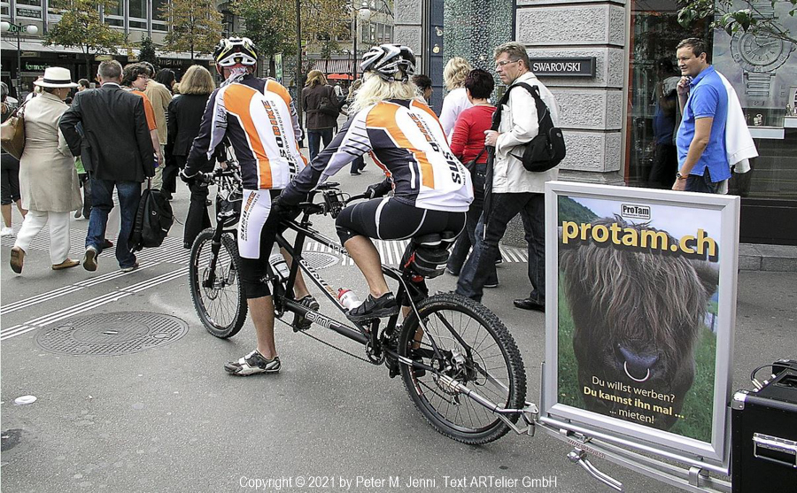 Punkt 11 Uhr am Samstag an der Zürcher Bahnhofstrasse: Der Promotion-Tandem-Generator (kurz ProTam genannt) rollt in die Bahnhofstrasse und ein erstes Mal ertönt der mit Kuhglockengebimmel untermalte und mit einem herzhaften Muh abschliessende Werbespruch „Hey, du, ja, du! Du kannst mich mal ….kannst mich mal mieten.“ Wie mit einem Schlag drehen sich die Köpfe der über die Bahnhofstrasse eilenden Menschen und was sie zu sehen bekommen, löst bei fast allen ein fröhliches Lachen, ein „Hey, das ist ja mega gei!l“ oder einfach nur ein freudiges Staunen aus.
