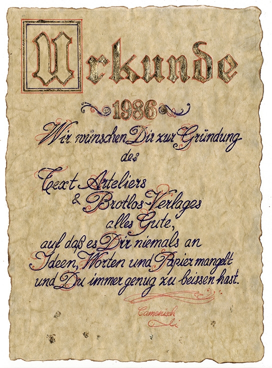 Anlässlich der Gründung des Text ARTeliers im Jahre 1986 erstellte der Grafiker Kurt A. Fischli eine Gründungs-Urkunde. Kürzlich hat der Künstler (www.artfischli.com) das Dokument restauriert und auch das Blattgold erneuert: Die «Schnüerlischrift» ist jetzt in Pariserblau und die vergoldeten Flächen 18 Karat Blattgold. Das Schriftstück lagert nun an einem sicheren, wohlbewachten Ort.