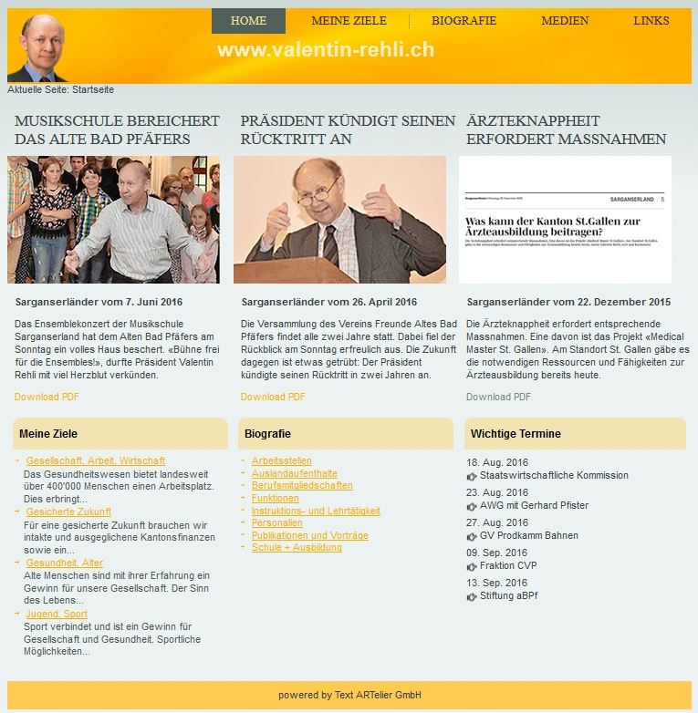 Die Website von CVP-Kantonsrat und Arzt Valentin Rehli (www.valentin-rehli.ch) wurde einem Relaunch unterzogen. Dies geschah vor allem im Hinblick darauf, dass immer mehr Internet-User mit dem Handy oder dem Tablet surfen - das responsive Display ist deshalb heute ein Muss.
